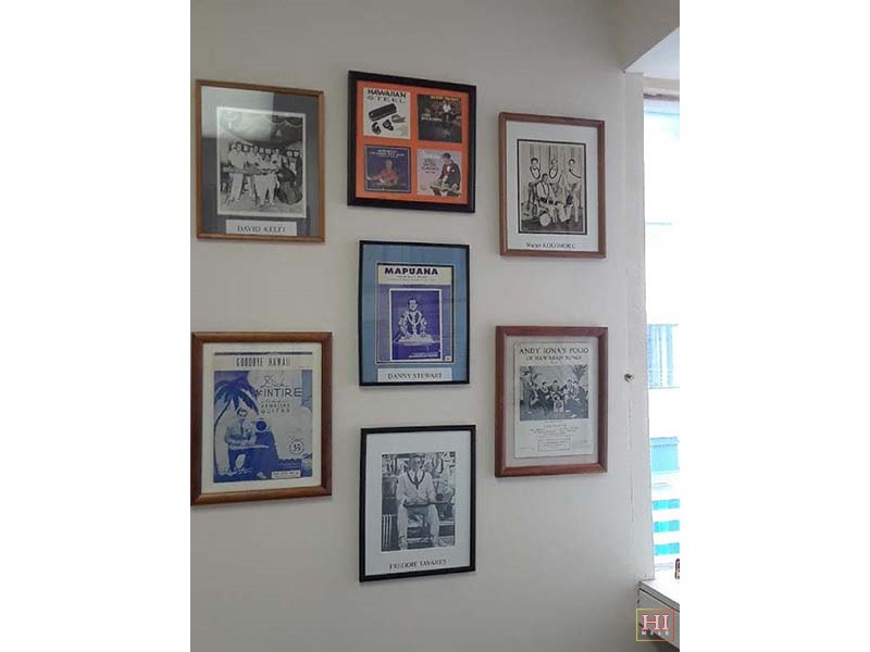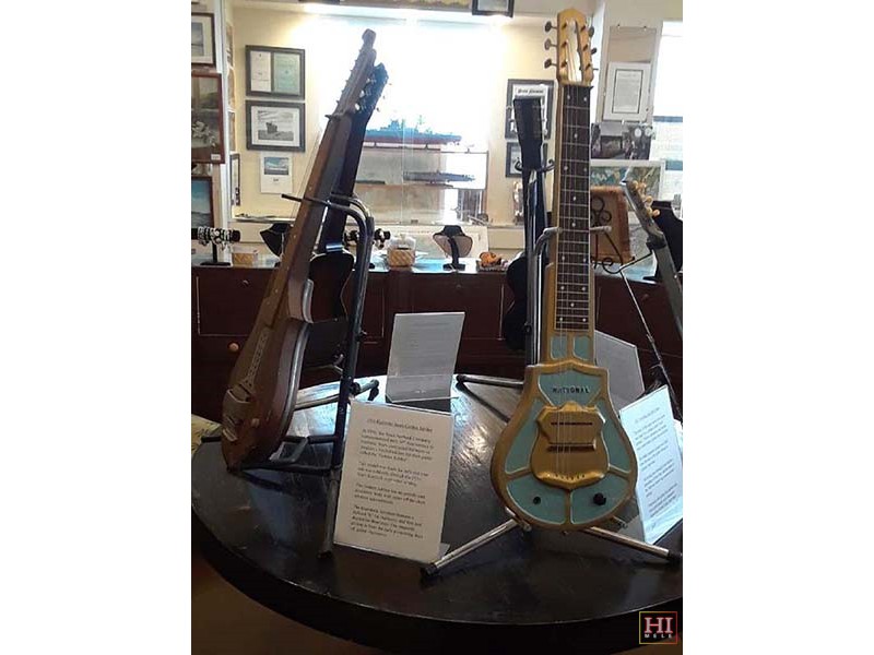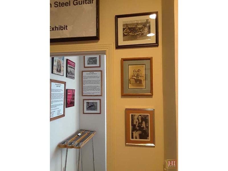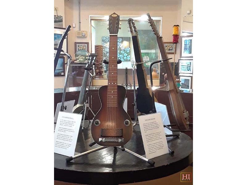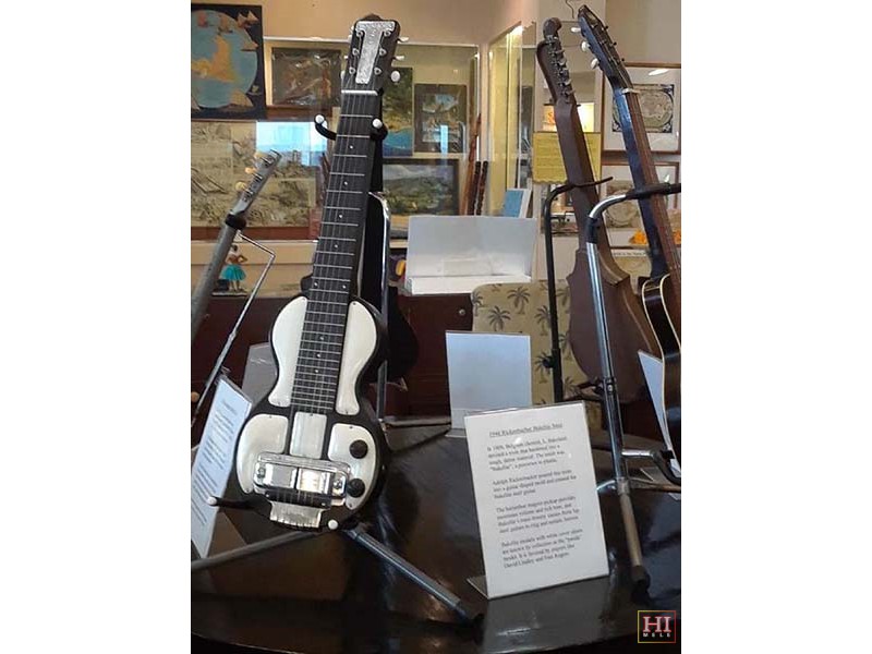 Finally, a collection of vintage Hawaiian Lap Steel guitars is displayed, including the famous Rickenbacher Frying Pan steel guitar.
